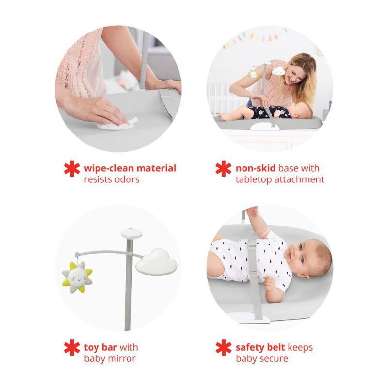 המשטח מתוכנן עם שוליים מוגבהים למניעת גלישה, וכמו כן מגיע עם חגורות לקשירה שהתינוק/ת לא יברחו/יתהפכו במהלך ההחתלה , מובייל קטן לשעשוע במהלך הטיפול בתינוק וניתן לניקוי בקלות בעזרת מגבון או מים — ללא צורך בכיסוי בד.
