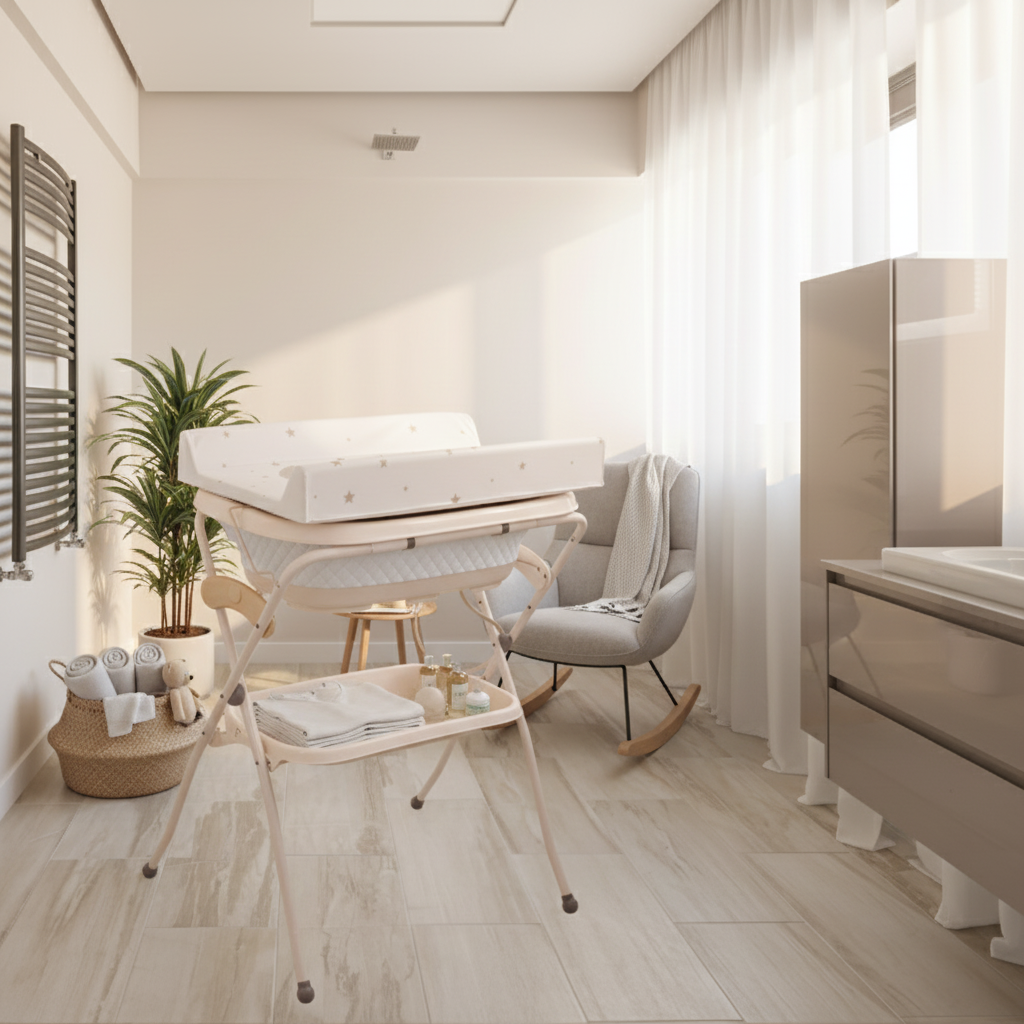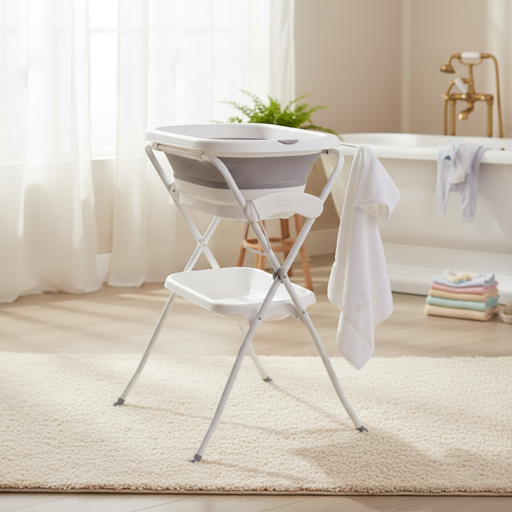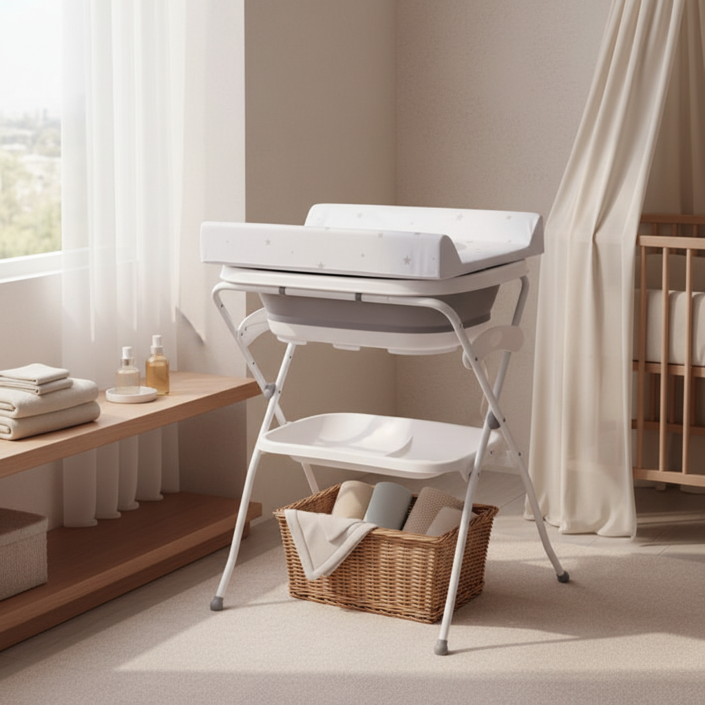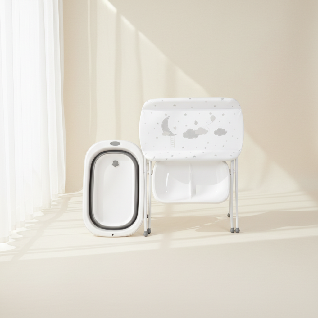 אמבטיה  מתקפלת עם מעמד ומשטח החתלה + חבילת מוצרים ראשונית