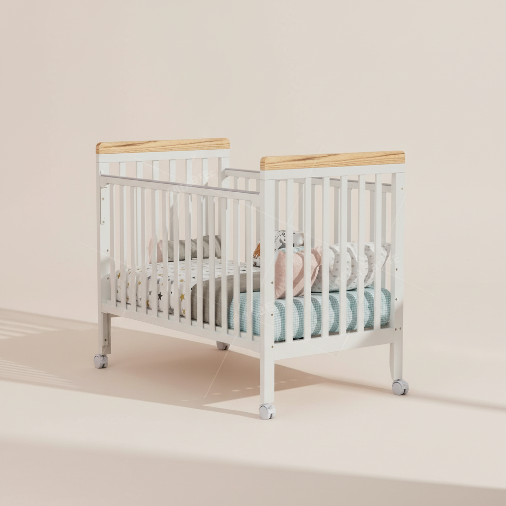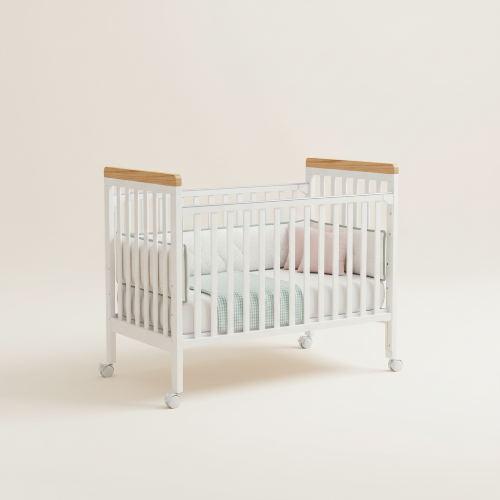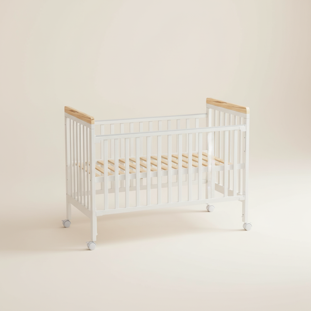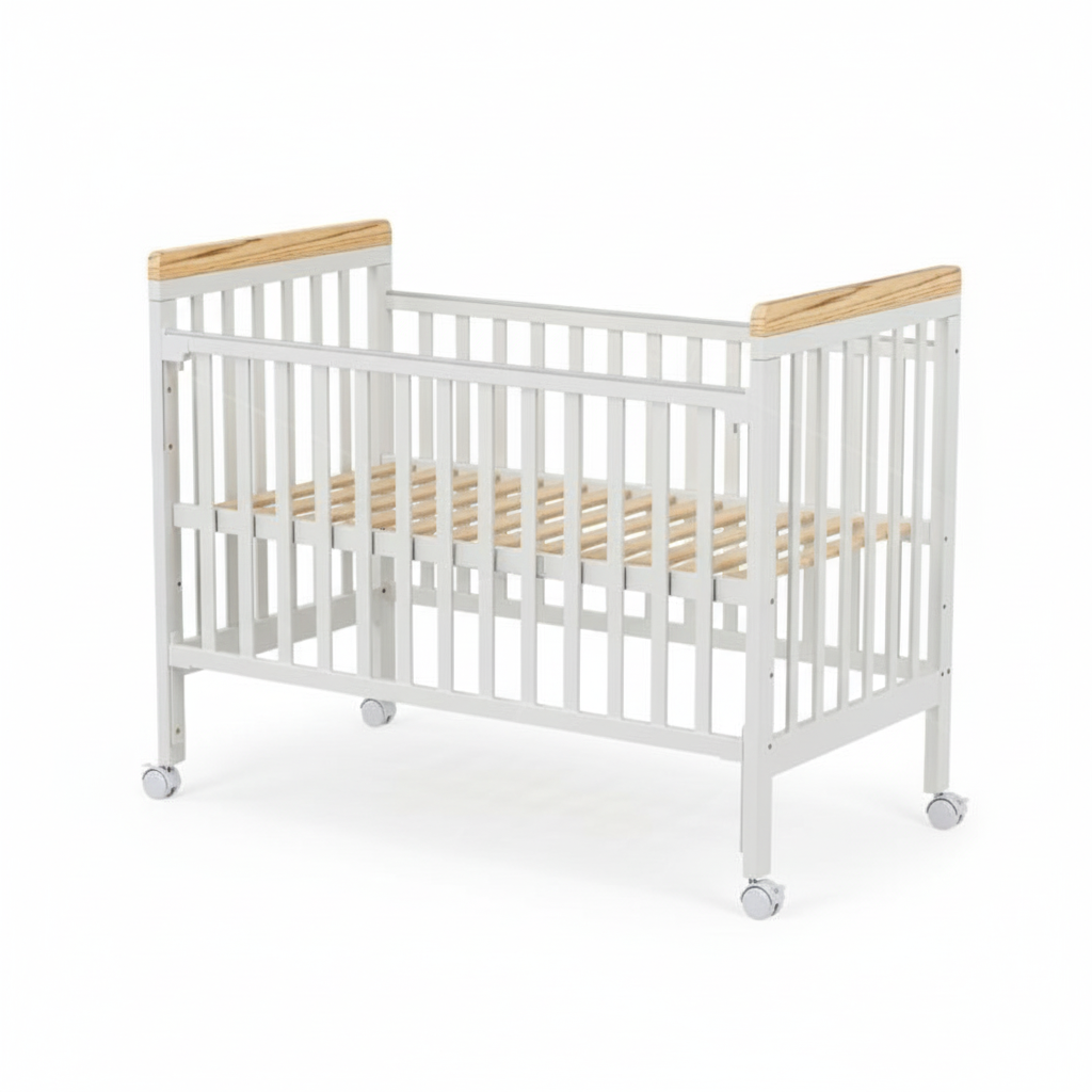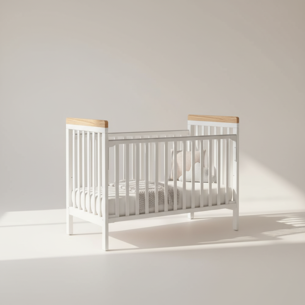 מיניגו – מיטת תינוק מעץ מלא, לבן עם שילוב עץ | מיטת תינוק