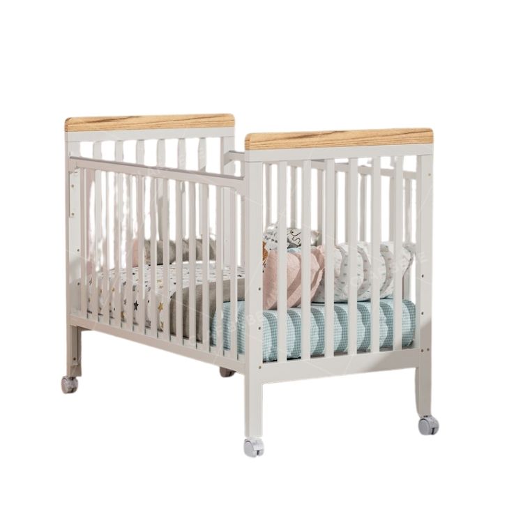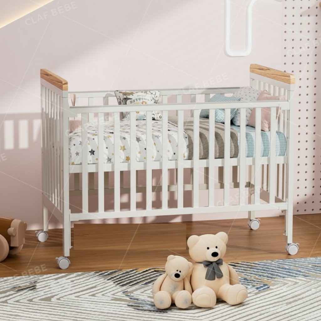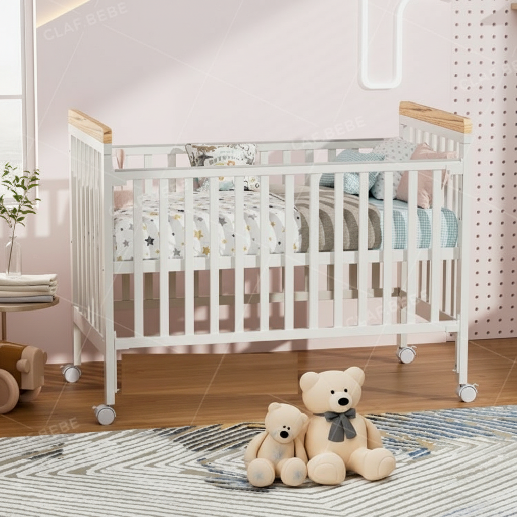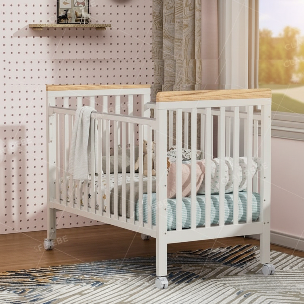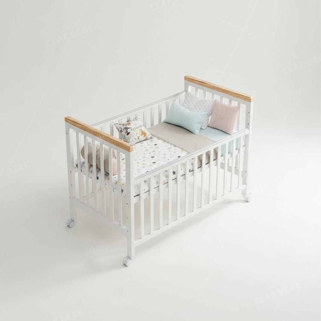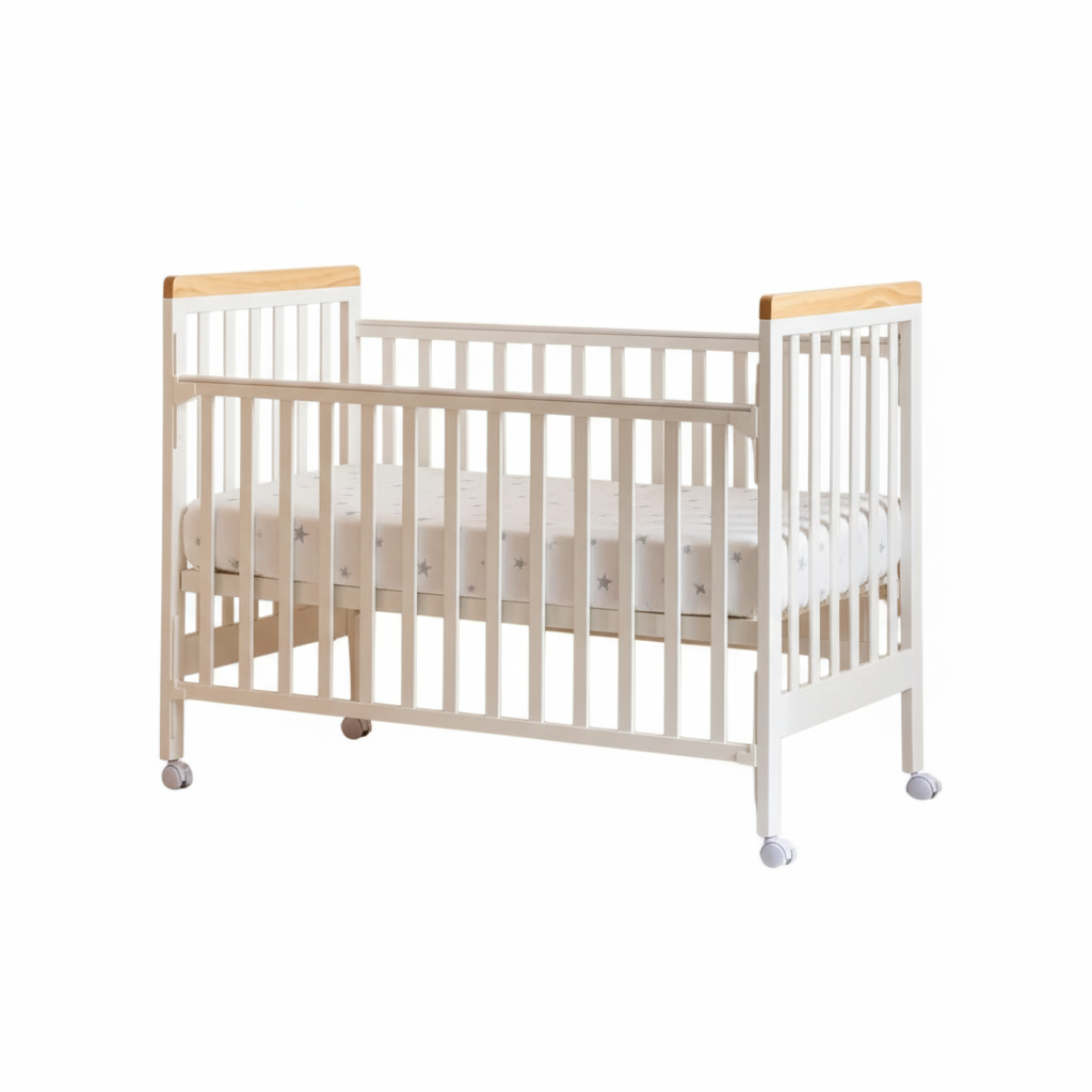 מיניגו – מיטת תינוק מעץ מלא, לבן עם שילוב עץ | מיטת תינוק