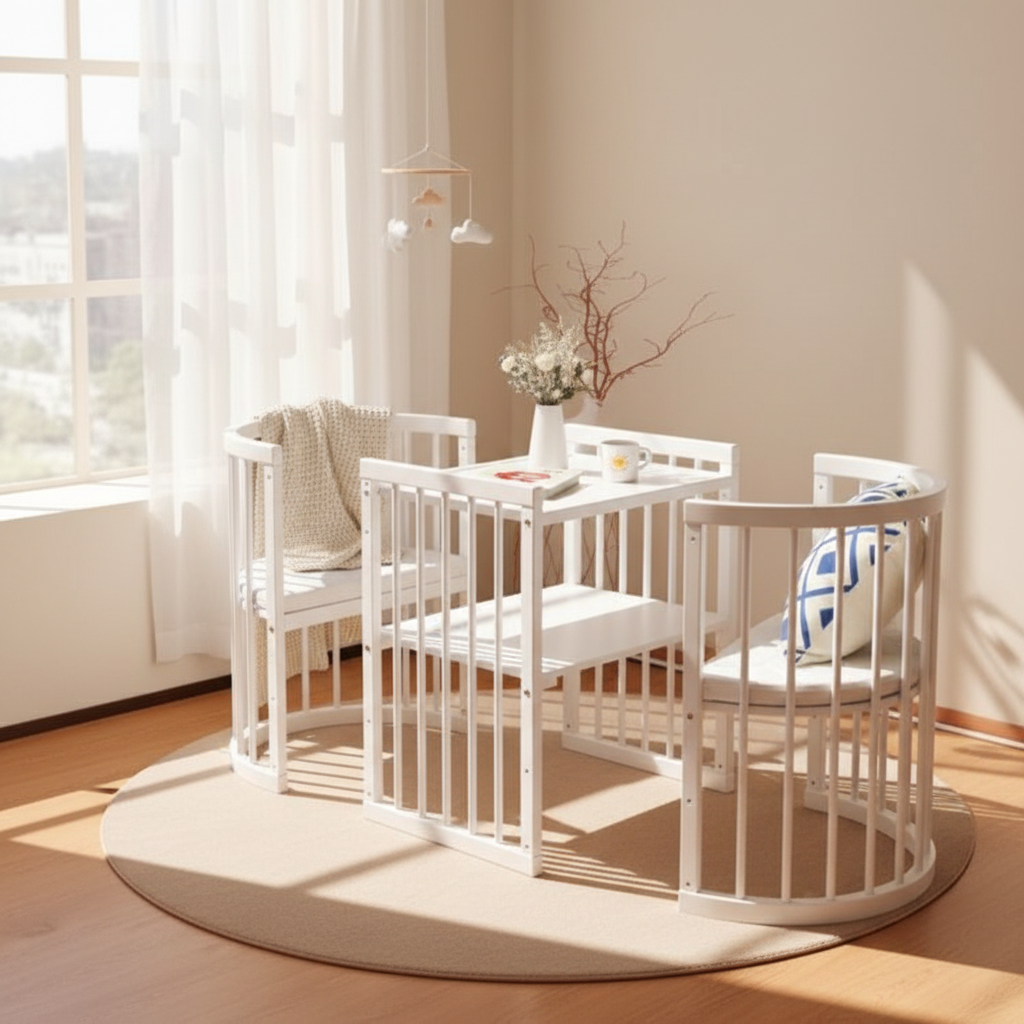 - עריסה ההופכת למיטה / מיטת מעבר ובסוף לפינת ישיבה לקטנטנים כולל מזרונים איכותיים לכל השלבים 2 צבעים לבחירה לבן וצבע עץ טבעי